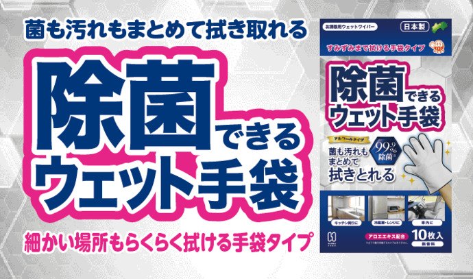 菌も汚れもまとめて拭き取れるので安心!手袋タイプで細かい場所も、隅々までらくらく拭ける!